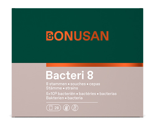 Bacteri 8 de Bonusan es una suplemento probiótico con ocho cepas bacterianas, aportando 5 mil millones de bacterias (por sobre o cápsula), además de inulina y FOS.