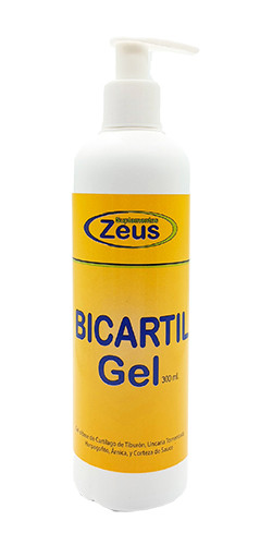 Bicartil Gel (Zeus) elaborado a base de Cartílago de Tiburón, Uña de Gato, Arnica, Harpagofito, Sauce y otros ingredientes necesarios para que en forma de gel pueda aplicarse directamente sobre las zonas doloridas o afectadas por problemas musculares, reumáticos y articulares.