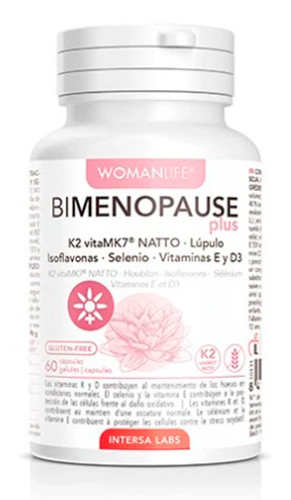 Bimenopause Plus a base de Isoflavonas de soja, extracto de Lúpulo, Vitaminas K2 y D3, antioxidantes (Selenio y Vitamina E) es un complemento específico para la mujer durante la menopausia.