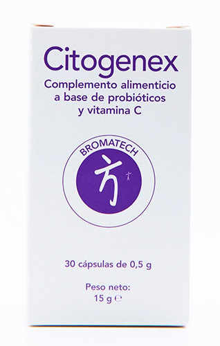 Citogenex (Bromatech) es un complemento alimenticio a base de fermentos lácticos (Lactobacillus acidophilus, Lactobacillus casei y Bifidobacterium lactis), extracto de Saccharomyces, y vitamina C, útil para promover el equilibrio de la flora bacteriana intestinal y apoyar el funcionamiento del sistema inmunitario.