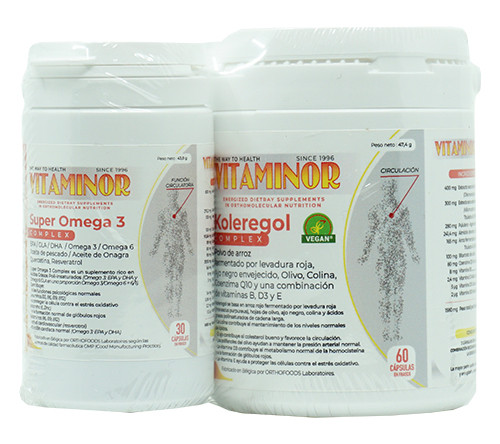 Este complejo de Vitaminor incluye arroz fermentado, Omega 3 y 6 (EPA y DHA), resveratrol y quercetina, entre otros ingredientes, minerales y vitaminas.