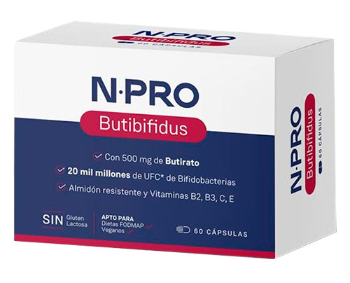NPro Butibifidus contiene en su formulación 500 mg de butirato, 20 mil millones de UFC de Bifidobacterias (avaladas por más de 10 estudios científicos) por dosis (2 cápsulas), almidón resistente tipo II y vitaminas B2, B3, C y E.