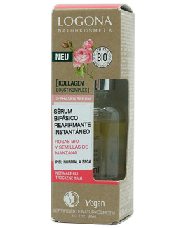 Sérum bifásico Reafirmante instantáneo de Logona proporciona un efecto antiedad inmediato, estimulando la producción de colágeno y reduciendo la aparición de arrugas.