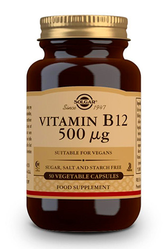 Vitamina B12 500 mcg (Solgar) es un producto alimenticio vitamínico que basa su fórmula en la Vitamina B 12 como cianocobalamina. La vitamina B12 es la única que contiene un mineral esencial, cobalto, oligoelemento esencial para el funcionamiento de las células del cuerpo, sobre todo de la médula ósea, vías gastrointestinales y sistema nervioso.